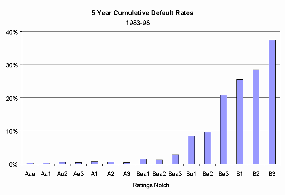 Validation is best explained by an example. Moody’s has been rating firms by numerically modified rating (that is, Ba2 as opposed to simply Ba), since 1983. It is important to note that Moody’s ratings are not simply default expectations, but also include expected loss. Nonetheless, the default experience by grade has been sufficiently stable to imply meaningful numbers that can be used for pricing and planning. Figure 1 below presents a validated rating system.