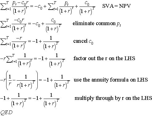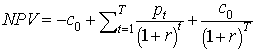 Assume an initial capital outlay c0, and payment receipts p every period until time T, discount rate r, and a return of the initial capital outlay. The NPV is thus the following: